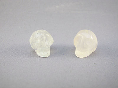 These Milky Quartz crystal skulls have a hole drilled from side to side to wear as a pendant, or hang as a talisman in your car, altar, above your bed, etc. They are clear Quartz with cloudy areas.